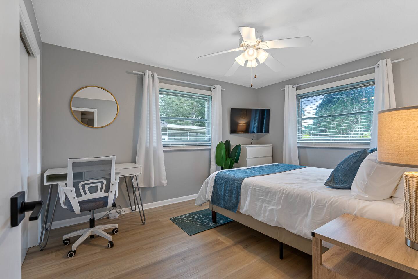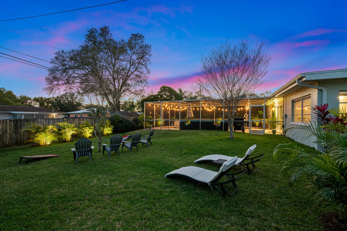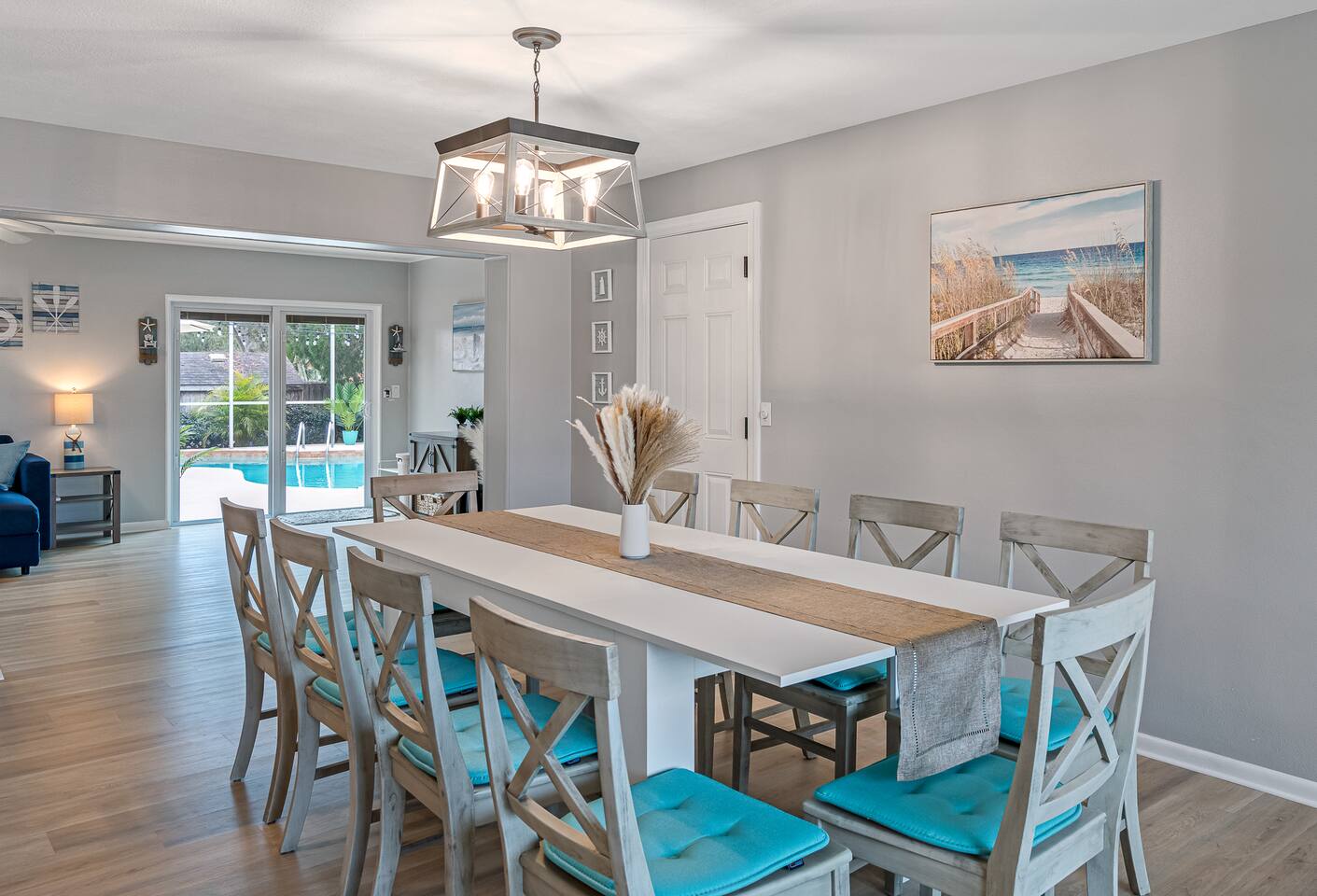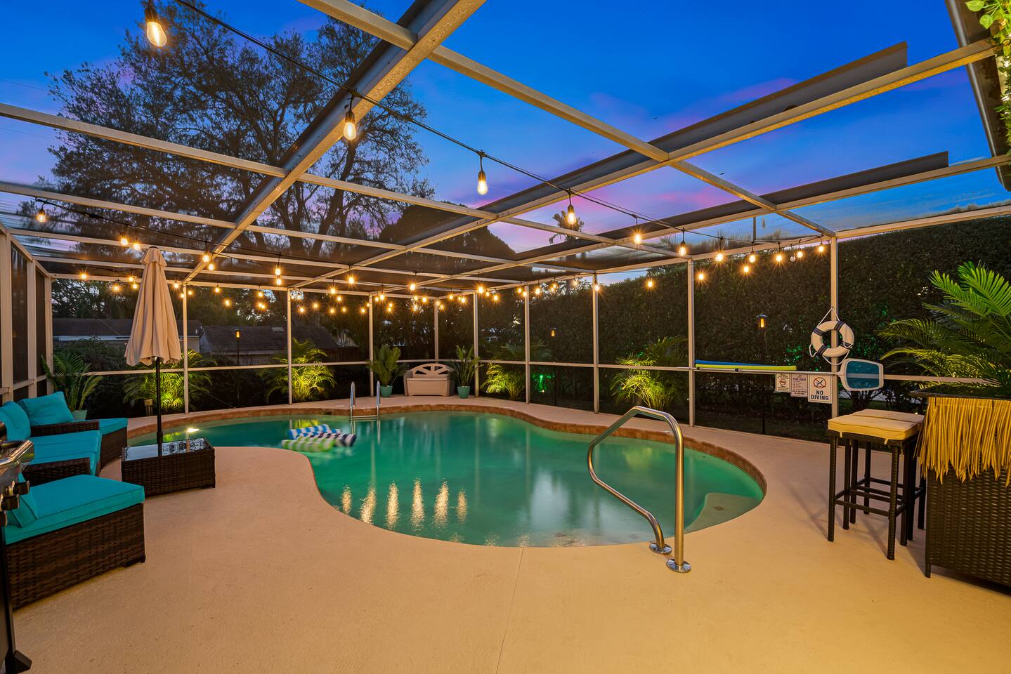 🌴 Paradise Palms was designed with family and friend vacationers in mind, featuring a high-quality renovation, a charming beach-themed design, and an extensive array of premium amenities. We’re dedicated to ensuring every guest has an unforgettable stay! ☀️ KEY FEATURES: ☀︎ 7 beds - 1 king bed, 2 queen beds, 1 bunk bed (twins), 2 queen pull out couches in separate living rooms ☀︎ Private Backyard - Includes HEATED saltwater pool with no additional daily fee, large pool inflatables, cornhole set, bocce ball, outdoor bar, premium sunbathing and patio furniture, adirondack lawn chairs, Char-Broil TRU Infrared Propane grill ☀︎ For the Kids & Toddlers - Pack-n-play crib, 2 high-chairs, kid sippy cups/bowls/plates/utensils, child-lock slider doors, 6.5 ft playpen/baby gate, baby monitor, baby bath, baby changing station, building blocks, outlet covers available ☀︎ For the Beach - 4 Beach Chairs, Umbrella, Drink Cooler, Beach Toys (Shovels, Pails, Boogie Board, Inflatables), and more! ☀︎ Cleaner than a Hotel - Meticulously deep cleaned by our team of professional cleaners between every stay. Cleanliness is VERY important to us. Previous guest reviews will attest to this. ☀︎ Fully stocked coffee bar - Premium espresso machine, Keurig, and coffee maker. Complimentary coffee k-cups, tea, decaf coffee k-cups, coffee grounds, espresso grounds, and many variations of creamers and sugars. ☀︎ Indoor Games - Full-sized ping pong table, board games, giant checkers/tic tac toe ☀︎ Laundry room w/ commercial-grade washer and dryer, detergent, dryer sheets, shout, and drying rack ☀︎ Complimentary sunscreen and aloe ☀︎ 2 dedicated workspaces located within the bedrooms ☀︎ 1 GB high-speed wifi and wifi extender ☀︎ 4 Roku Smart TVs (65" in the living room) with guest-mode activated ☀︎ Complimentary Toiletries - Includes premium shampoo, conditioner, body wash, iron, mini ironing board, and hairdryers ☀︎ Comfortable beds with high-quality linens ☀︎ More than enough towels, toilet paper, paper towels, and extra bed sheets ☀︎ Fully equipped kitchen with modern appliances and some spices ☀︎ Detailed digital guidebook with our personal local recommendations, an effective AI Vacation Planner, and detailed "how-to's"/list of amenities ☀︎ A few minute walk away from the beautiful, 162-acre Eagle Lake Park, a grocery store, restaurants, and more ☀︎ See full list of amenities below! Expect a Five Star stay with us. Here’s what a few guests have said: “One of my favorite Air Bnb stays to date. The rooms were comfy and the place was spacious for me and my family…Everyone loved the fully stocked coffee bar too! Thanks for providing such a beautiful space.” - Jennifer “This place was everything I could have asked for and more. The hosts were very prompt to answer any questions we had. The home was extremely clean and they thought of everything right down to the smallest of details, I couldn't believe they had a set of children's plates/utensils/cups. tons of stuff for the pool and the beach, I didn't have to pack anything.” - Christina “Where to begin…I am a cleaning fanatic and I worry about cleanliness. This house made me feel right at home. Extremely clean, clean linens and towels…The communication was FANTASTIC. I only had one question because the itinerary was so detailed and I had a response right away. We would rent this house again.” - Heather ☆☆ BEDROOMS ☆☆ Master Bedroom – Wake up to the beauty of the Florida sunrise, with the soft glow of morning light streaming through your window and the gentle sway of palm trees just outside. Imagine stepping out of bed and being only moments away from a refreshing dip in your private, heated saltwater pool. Before you head out, indulge in a freshly brewed cup from the fully stocked premium coffee bar, perfectly positioned for your morning routine. The master suite features a luxurious king-size bed, a dedicated workspace with a sleek desk, and a 58” smart TV for your entertainment. Enjoy the convenience of ample closet and drawer space to unpack and make yourself at home, complete with full-length mirrors for trying on your outfits. Built-in outlets in the nightstands make charging your devices a breeze. With your own private en-suite bathroom, featuring a walk-in glass shower and a spacious vanity designed for two, this master bedroom offers a serene retreat where comfort and convenience meet. Second Bedroom – Designed for peaceful relaxation, the second bedroom mirrors the tranquility of the master suite, ensuring your luxury vacation experience begins the moment you open your eyes. This room features a plush queen-size bed, a dedicated desk/workspace for any remote work or quiet moments, full-body mirrors, and ample closet and drawer space to unpack your belongings. Just steps away from the second full bathroom, this room offers both comfort and convenience for a restful stay. Third Bedroom – Perfect for families or groups, the third bedroom offers direct views of the sparkling pool and lush backyard oasis, ensuring you’re reminded of the resort-style luxury just outside. This room is equipped with both a luxury queen-size bed and a fun bunk bed (2 twins), making it ideal for kids or extra guests. The room also includes a closet, luggage racks, and plenty of space to relax and unwind. Each bedroom is thoughtfully equipped with high-quality linens, Roku TVs for entertainment, and nightstands with built-in outlets for easy charging. ☆☆ BATHROOMS ☆☆ The home features two beautifully appointed, beach-themed full bathrooms, each thoughtfully stocked with all the essentials to make your stay as comfortable as possible. You’ll find plush towels, toilet paper, shampoo, conditioner, body wash, hand soap, and a hairdryer—everything you need to feel right at home from the moment you arrive. ☆☆ KITCHEN & DINING ROOM ☆☆ The bright and inviting ki